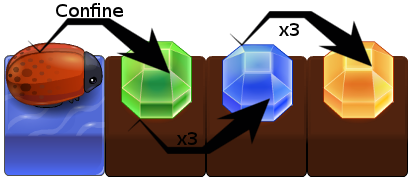 Parfois, vous devez placer des "Insectes". Ils se déplacent librement sur le plateau et vous empêchent de positionner d'autres éléments. Pour les tuer, il suffit de les enfermer dans une zone ne contenant plus aucune cellule libre. Ils se changent alors en diamant vert. Les diamants peuvent se combiner comme les blocs :
